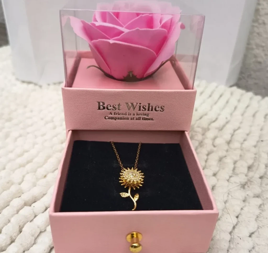 Hermoso cofre de rosa de petalos de Jabon + Collar de acero y dije magico