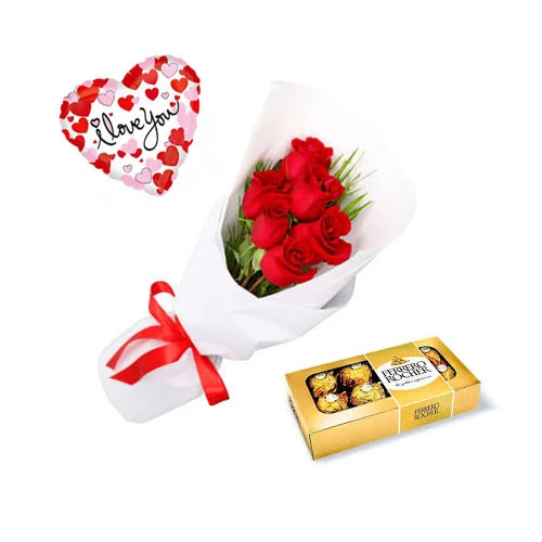 Este set exclusivo incluye 6 rosas rojas frescas, un globo con forma de corazón con mensaje “I love you” y una deliciosa caja de Bombones Ferrero Rocher, todo presentado con elegancia y listo para conquistar corazones.