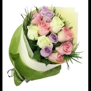 Este exquisito bouquet está compuesto por rosas frescas en tonos pastel: rosa suave, lavanda, blanco y durazno. Una selección armoniosa y delicada, ideal para transmitir cariño, gratitud o admiración con un toque de color y frescura.